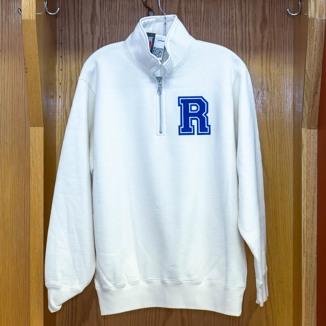 The CSP Embroidered Quarter Zip by Civilian Screen Printing features a clean white fabric with a distinctive monogrammed "R" on the chest, offering a timeless collegiate aesthetic. Its quarter-zip design ensures easy layering and adjustable comfort, while the full back graphic adds a bold, classic touch. Perfect for fans seeking a sophisticated yet casual look backed by quality craftsmanship.