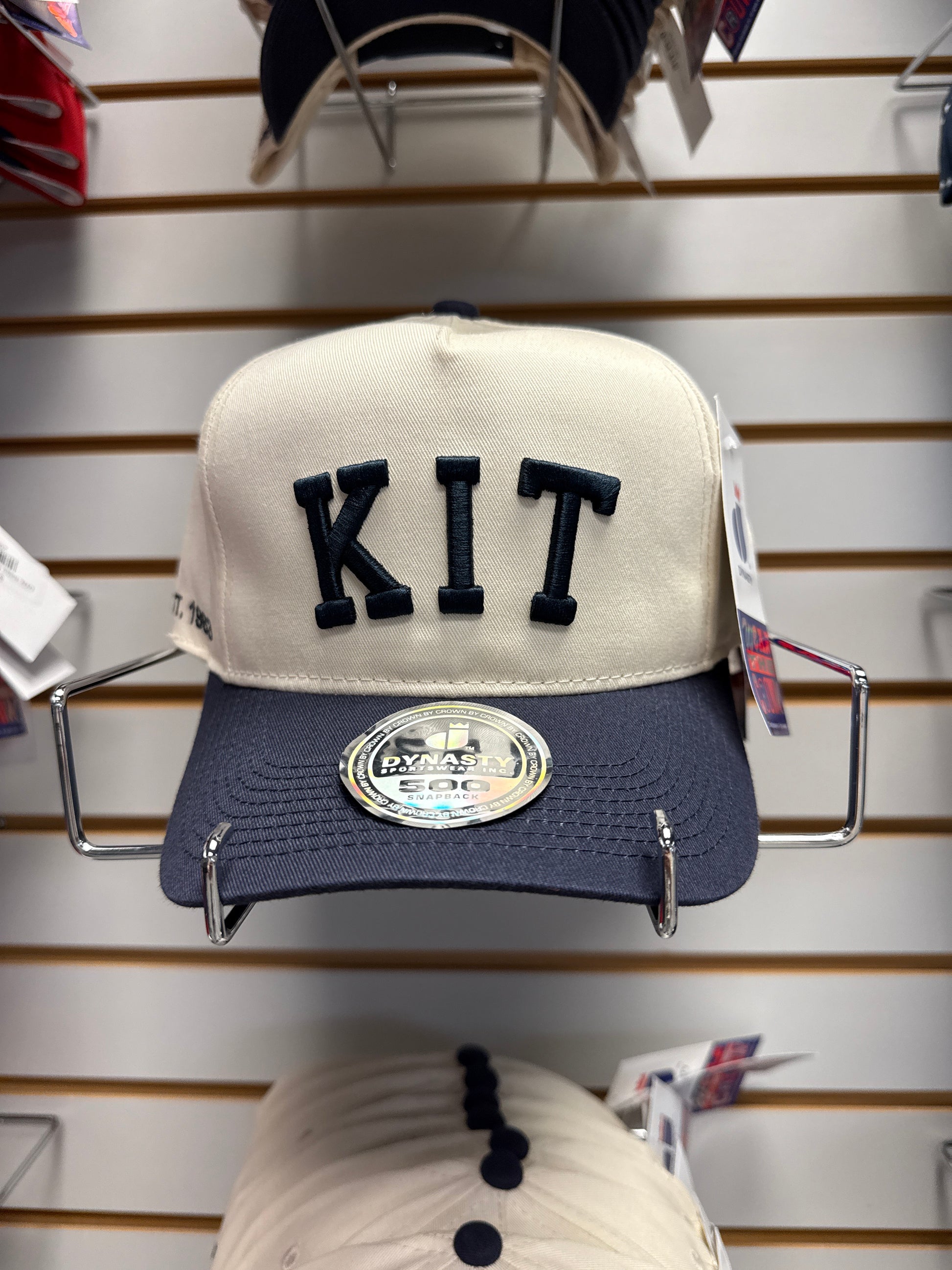 Expertly crafted with a navy and offwhite color scheme, the DYN. Natural/Navy KIT hat is a stylish addition to your wardrobe. Featuring the letters KIT on the front, this hat is perfect for showcasing your unique sense of fashion. Made with high quality materials, it is sure to provide comfort and durability.